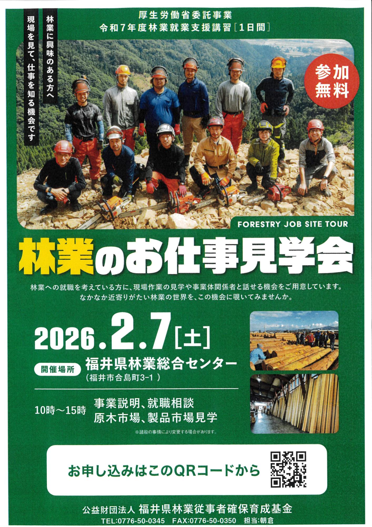 (公財)福井県林業従事者確保育成基金では2026年2月7日(土)に林業のお仕事説明会を開催します。希望者には木材の値段を決める原木市場や工務店や住宅メーカー向けの製品市場の見学などいたします。