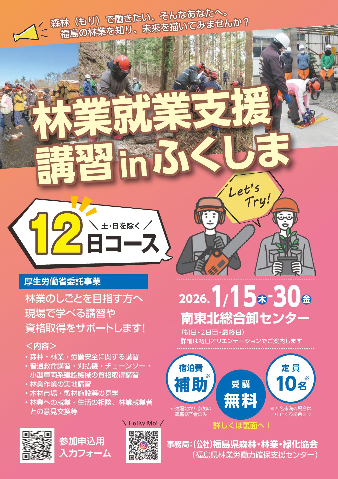 | 詳細 | 【参加条件について】 ・林業への就業を希望し林業作業未経験の18歳以上 ・講習全日程に参加が可能な方 ・集合場所への集合が可能な方 ・自家用車(レンタカー含む)等交通手段のある方 ・冬タイヤを装備(準備)できる方 【受講の可否について】 ・申込受付後、受講動機などの聞き取りを行います。 資格取得のみを目的とする方はご遠慮願います。 受講の可否については別途ご連絡します。 |