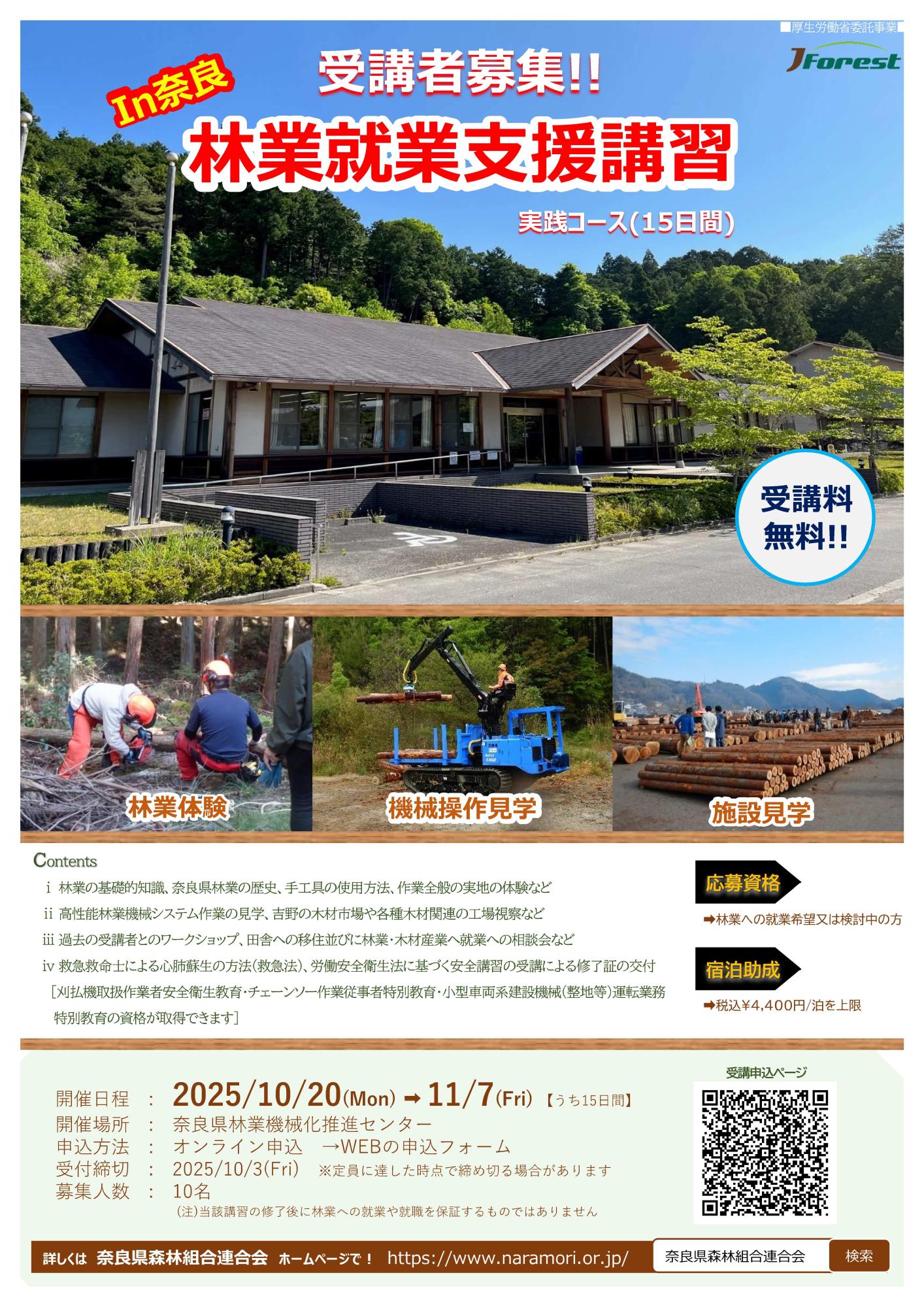 備考 | ご不明な点はお気軽にお問い合わせください。 \ 講習終了日 11/7(金) の翌日からも要チェック / ✅11/8 奈良県の求人のある林業企業が集まる 森林の仕事ガイダンスin奈良2025~合同会社説明会~ 詳しくはこちら https://narawoodjob.wixsite.com/narawoodjob ✅11/9 林業を学べる学校 奈良県フォレスターアカデミーオープンキャンパス 詳しくはこちら https://nfa.ac.jp/ |
