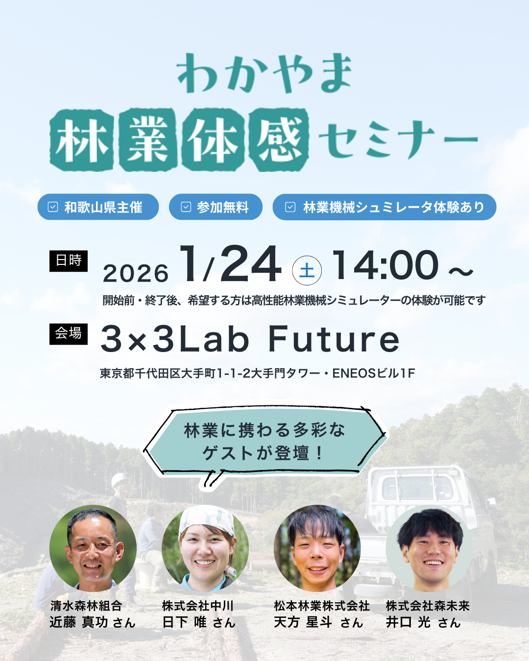 | 詳細 | 林業の基礎知識や和歌山の林業の特徴、和歌山県での暮らしなど、『林業就業』に関わる支援をトータルで提供するセミナーです! 先輩林業就業者・移住者の体験談を直接聞けるトークセッションや、林業就業・移住の支援制度の紹介も行います! セミナー終了後に個別相談も可能! 現場で働くきのくにフォレスターのほか、 ・県の林業、移住担当者 ・和歌山県農林大学校林業研修部(林大) ・わかやま林業労働力確保支援センター の担当者からも詳細な説明あり◎ |