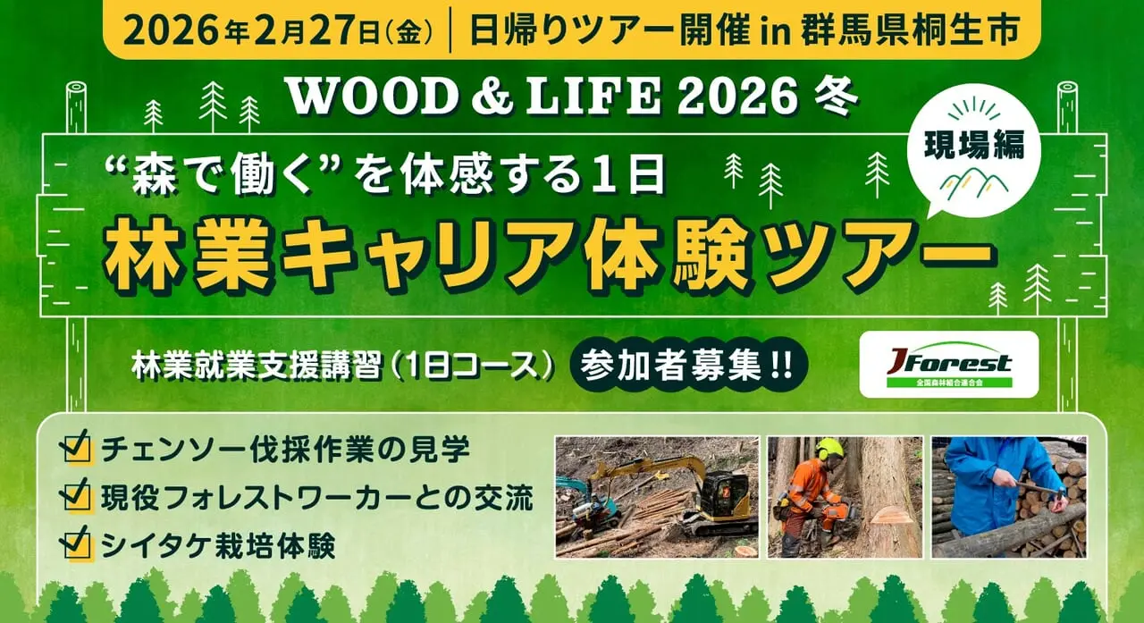 | 詳細 | 【こんな方におすすめのイベントです!】 ✅ 自然の中で働いてみたい! ✅ 林業に興味があるけど、不安や疑問がある ✅ 未経験からキャリアチェンジできるか知りたい! ✅ 移住や地方での働き方に関心がある ✅ 群馬県の林業を知りたい! 【このイベントで得られること】 ✅ 林業の全体像や仕事の流れが理解できる ✅ 現場で働く人の本音”が聞ける ✅ 必要な資格、安全管理、キャリア形成のポイントがわかる ✅ 群馬・桐生のフィールドの特徴がわかる ▼詳細・お申し込みはコチラから▼ https://turns.jp/131321 -+-+-+-+-+-+-+-+-+-+-+-+-+-+-+-+-+ 【日時】 2026年2月27日(金)9:00〜17:00 【集合場所】JR高崎駅東口ロータリー 【参加費】1,000円(昼食代) 【定員】20名 ※定員を上回る場合は選考します 【対象者】 ・未経験者歓迎! ・自然が好きな方 ・林業に興味がある方 ・移住やキャリアチェンジに関心のある方 etc. 【注意事項】 本ツアーは、応募状況により「選考」にて参加者を決定いたします。 選考にあたっては、ツアーへの参加意欲、および年齢層を総合的に勘案いたします。 企画趣旨に沿った運営のため、ご理解賜りますようお願い申し上げます。 -+-+-+-+-+-+-+-+-+-+-+-+-+-+-+-+-+ ❮スケジュール❯ 09:00〜|JR高崎駅 東口ロータリー集合(マイクロバスにて移動) 10:15〜|桐生広域森林組合にてオリエンテーション 11:00~|桐生広域森林組合の林業現場の見学 12:30〜|昼食 13:45~|森産業株式会社にてシイタケ栽培の座学、施設見学、駒打ち体験 17:00〜|JR高崎駅 東口ロータリー解散 たくさんの皆さまのご応募お待ちしています!! |